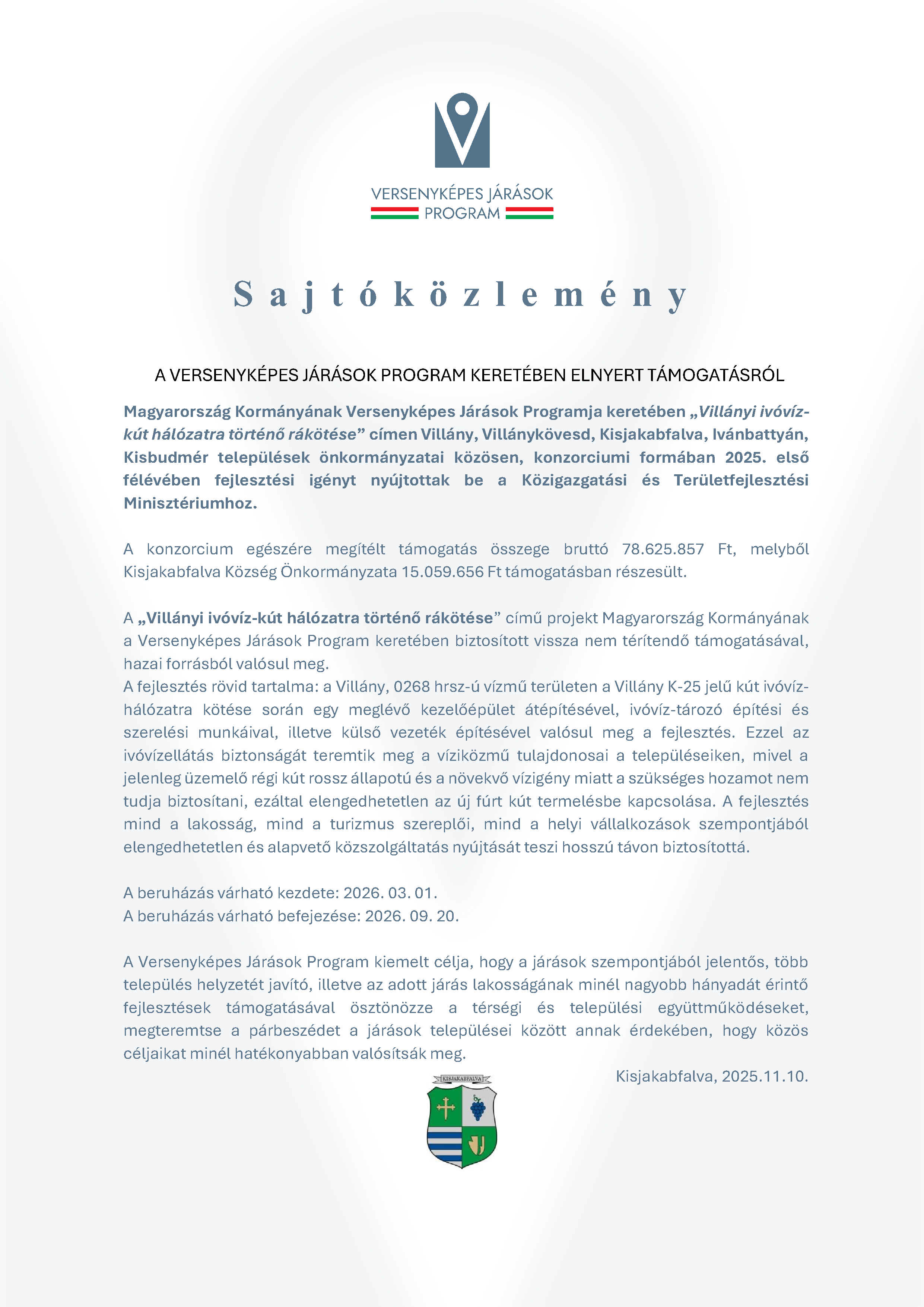 A konzorcium egészére megítélt támogatás összege bruttó 78.625.857 Ft, melyből Kisjakabfalva Község Önkormányzata 15.059.656 Ft támogatásban részesült.